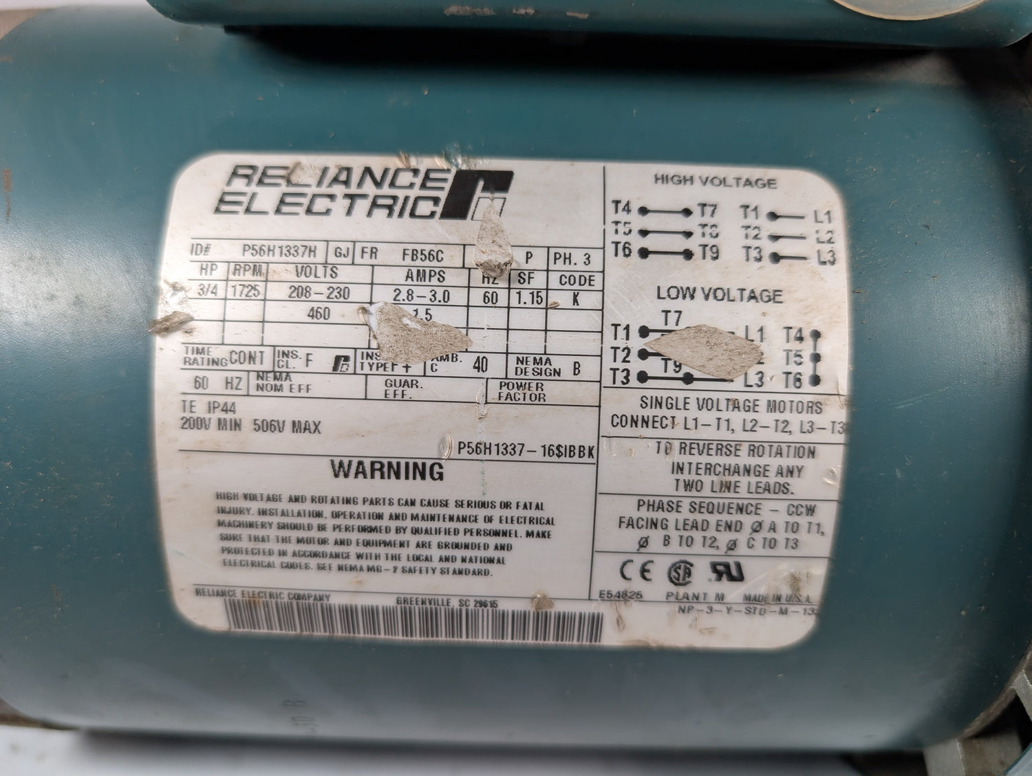 Reliance Electric - 0.75 HP Electric Motor - P56H1337H - Used - REACHE0-00015 is backordered and will ship as soon as it is back in stock.