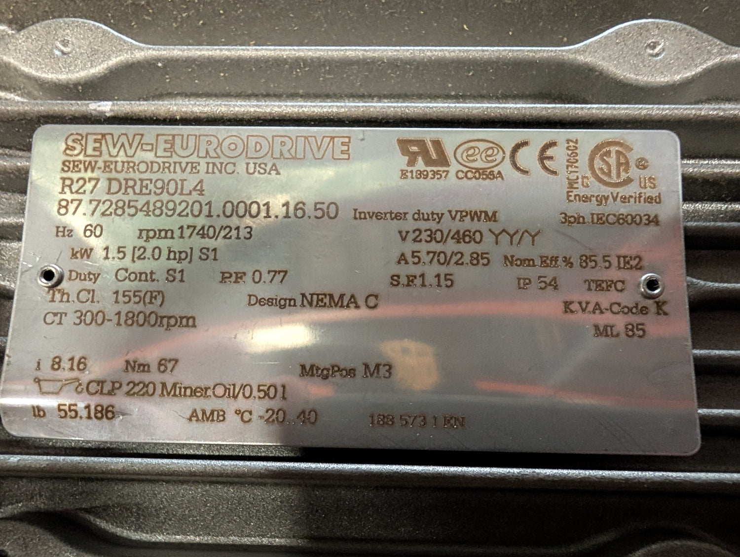 Sew-Eurodrive - 2 HP Electric Motor - R27 DRE90L4 - Used - REACHE0-00053 is backordered and will ship as soon as it is back in stock.