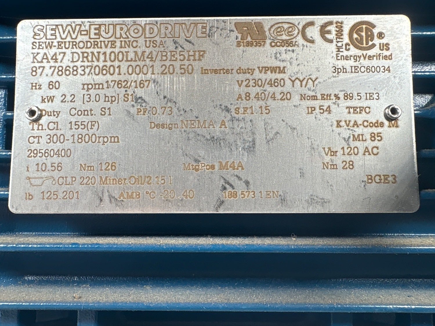 Sew-Eurodrive - 3 HP Helical-Bevel Gearmotor - KA47 DRN100LM4/BE5HF - Used - BBB-PEND0-00736 is backordered and will ship as soon as it is back in stock.