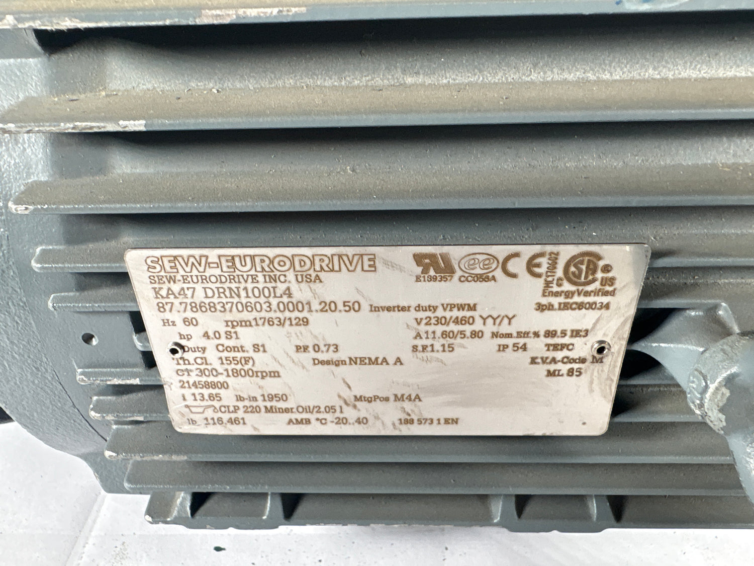 Sew-Eurodrive - 4 HP Helical-Bevel Gearmotor - KA47 DRN100L4 - Used - BBB-PEND0-00750 is backordered and will ship as soon as it is back in stock.
