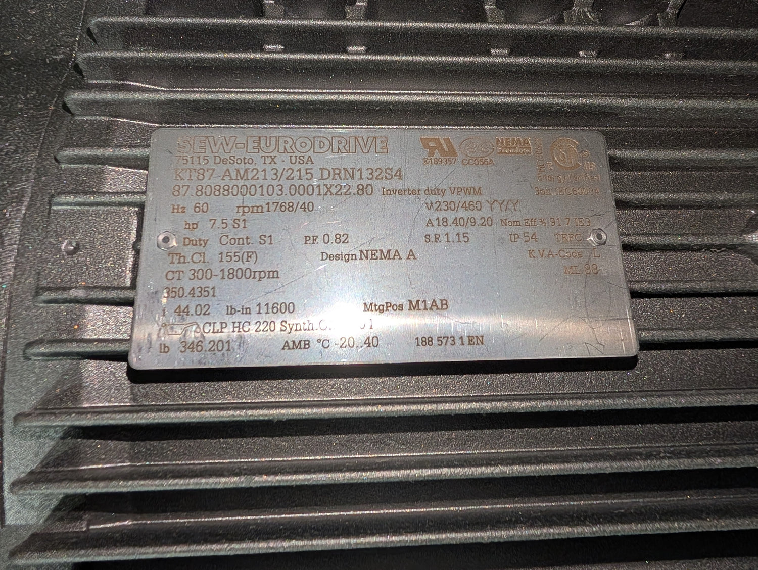 Sew-Eurodrive - 7.5 HP Helical Bevel Gearmotor - KT87 AM213/215 DRN132S4 - New - CBRCAN0-00010 is backordered and will ship as soon as it is back in stock.